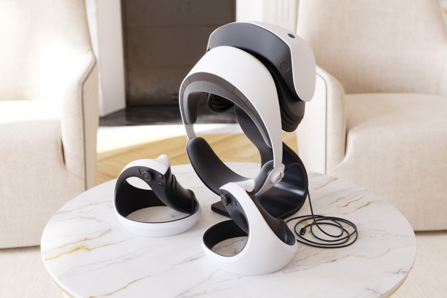 Futuristic and minimalist headset for VR games. Contains a headset, two controllers, and a stand.