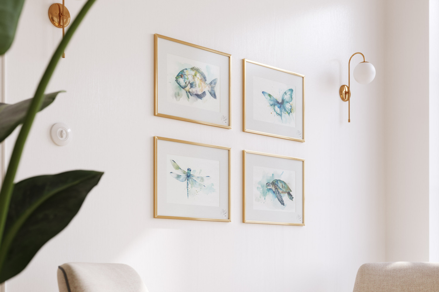 Set of four handcrafted watercolor paintings with signature. Framed in a gold frame.